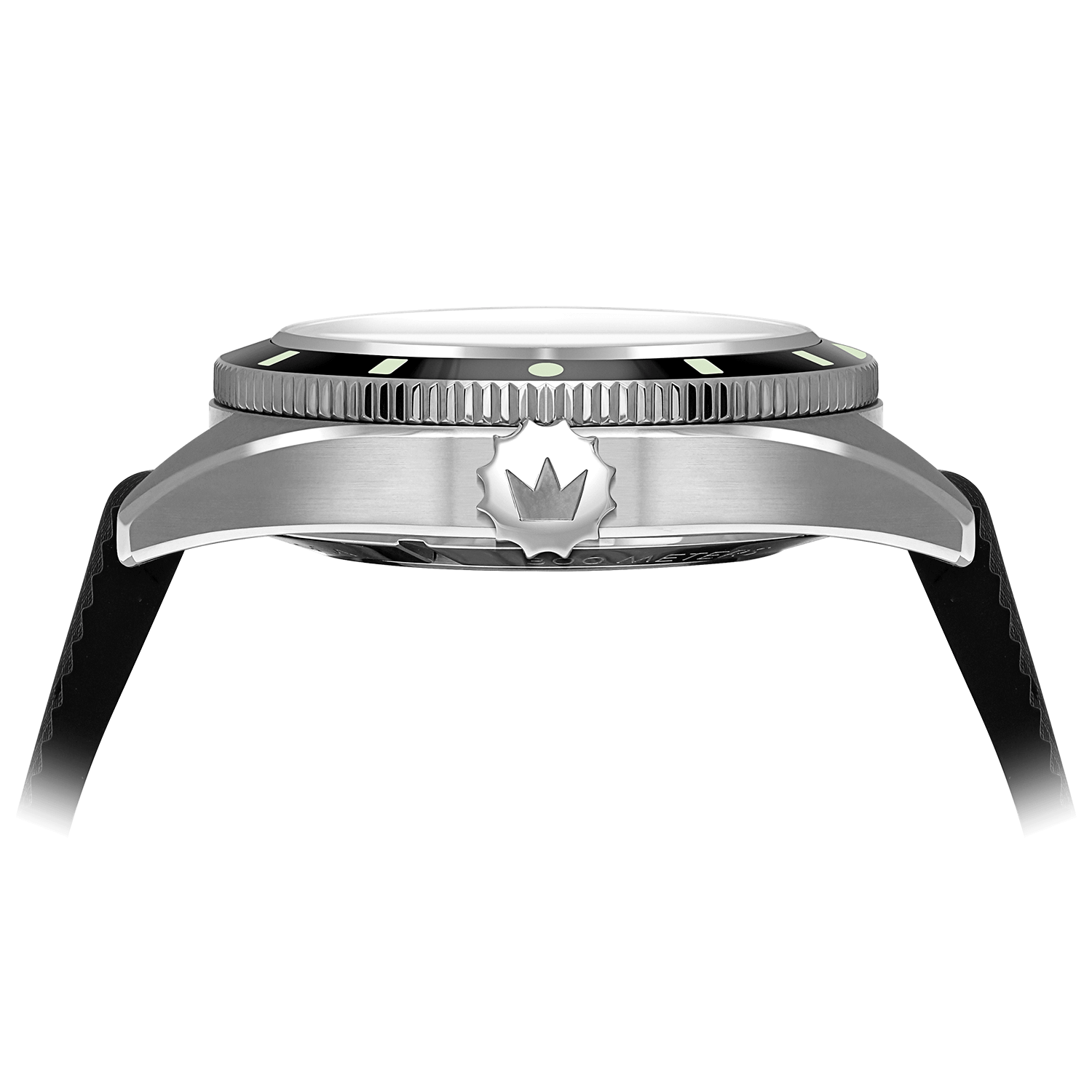Strap: Black FKM rubber "Tropic" strap, offering comfort and durability, suitable for both diving and daily wear.